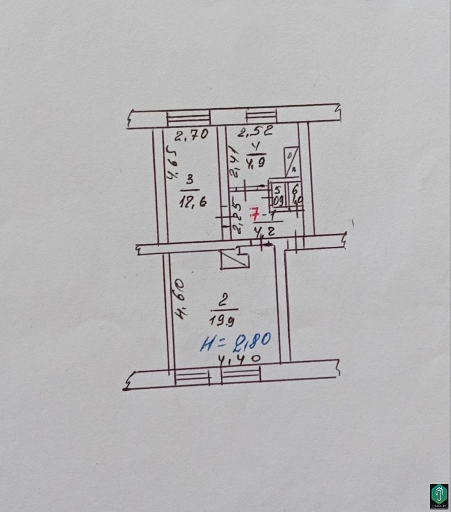 Общая площадь 43.5 кв.м.,  жилая площадь 32.5 кв.м. (комнаты  19,9 кв.м.,  12,6 кв.м.) Высота потолков 2.8 м.